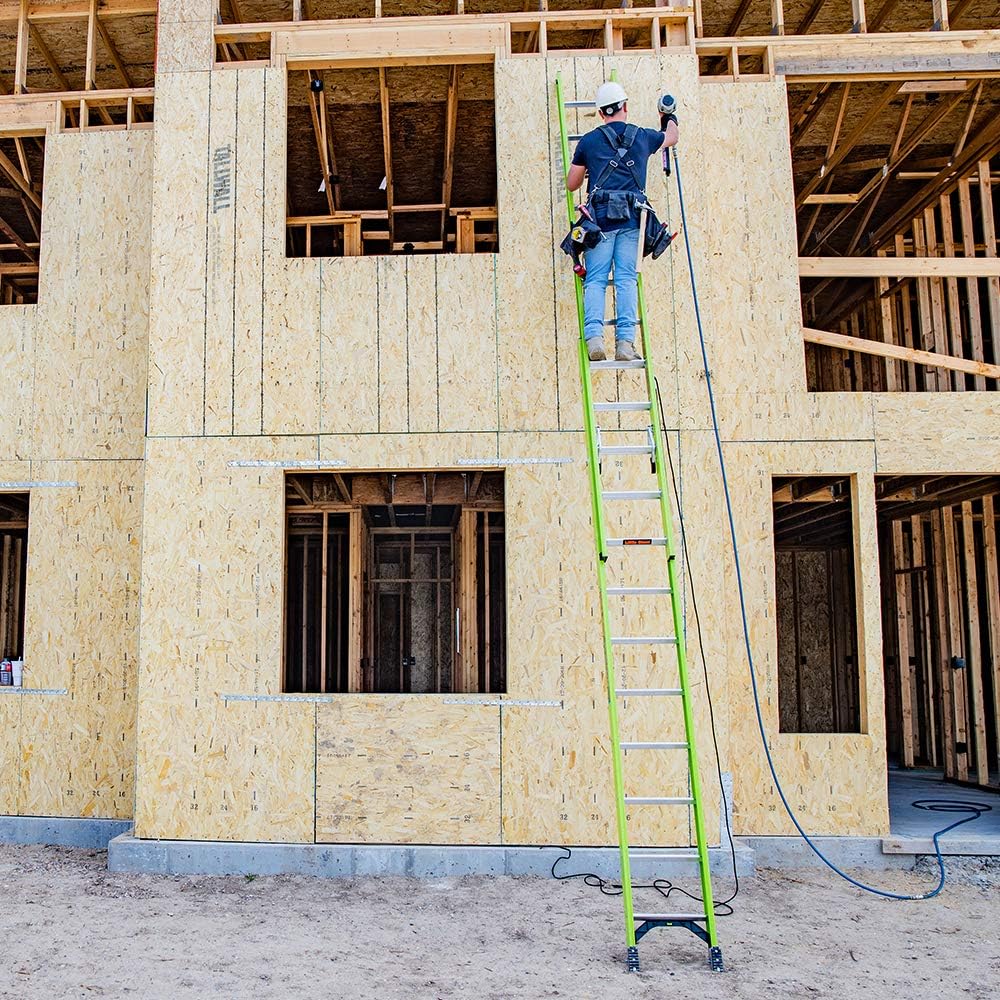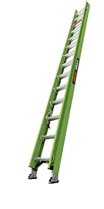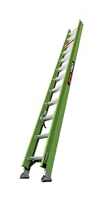 Using a tall extension ladder can be intimidating, but with the right ladder, it doesn’t have to be. The Little Giant® HyperLite® was designed with safety and ease of use in mind, so you can focus on the task-at-hand, rather than worrying about your ladder. - LIGHTWEIGHT - The HyperLite is an ultra-lightweight, non-conductive fiberglass ladder. Most extension ladders are incredibly heavy; and carrying them can cause injuries from the weight; but this ladder weighs up to 40 percent less than traditional fiberglass ladders. - DOUBLE PULLEY - In the past, extension ladders’ pulley systems were in the way and tough to use. We moved the pulley to the side of the ladder and incorporated double pulleys to make operation simple. Getting enough leverage to raise the ladder is fast and easy. - OTHER BENEFITS - Made with our patent-pending Hi-Viz green fiberglass, you can avoid incidents associated with walking or driving into the extension ladder. Ground Cue® helps when descending the ladder, signaling when you have reached the bottom rung. With wide rungs, the ladder is more comfortable than others, decreasing foot fatigue from standing atop a ladder. The HyperLite meets or exceeds all OSHA and ANSI standards and rated Type 1A to hold 300 lbs.